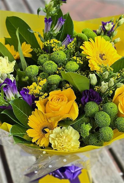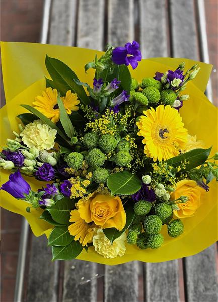 A zesty bouquet arranged in golden yellows, lime greens and vibrant purples.