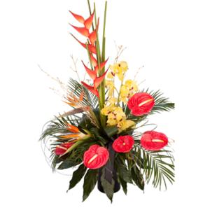 Tall Cymbidium Orchids, Heliconia and Strelitzia rise above passion-red Anthurium flowers and green-leaf foliage. Presented in a large black cylinder vase.