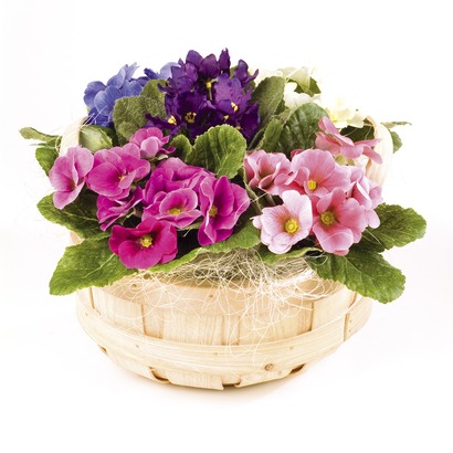 A vibrant collection of seasonal flowering primula presented in a complimenting container.